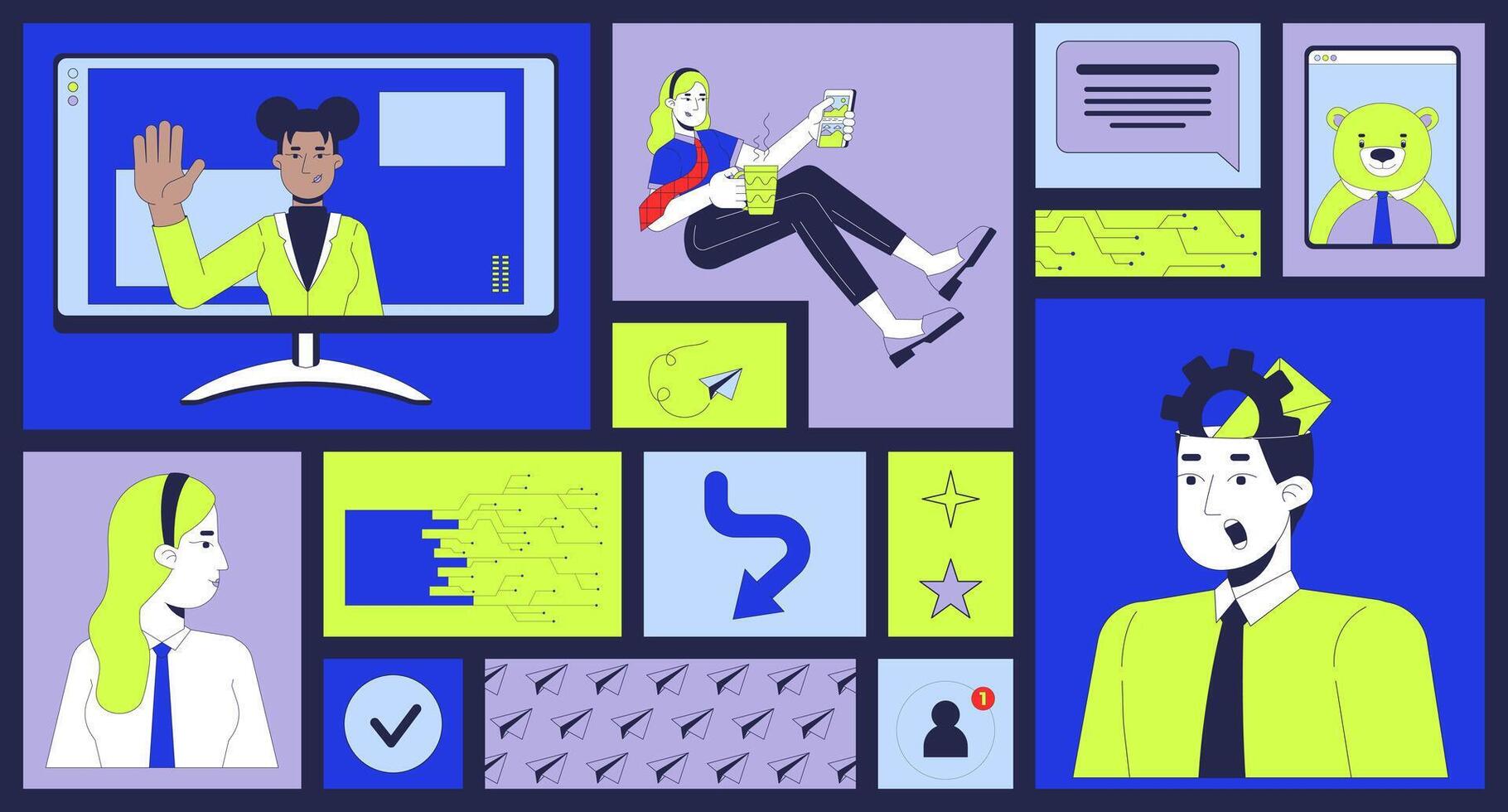 Digital messaging and online interaction in media bento grid illustration set. Technology communication 2D image collage design graphics collection. Diverse flat characters moodboard layout Pro Vector