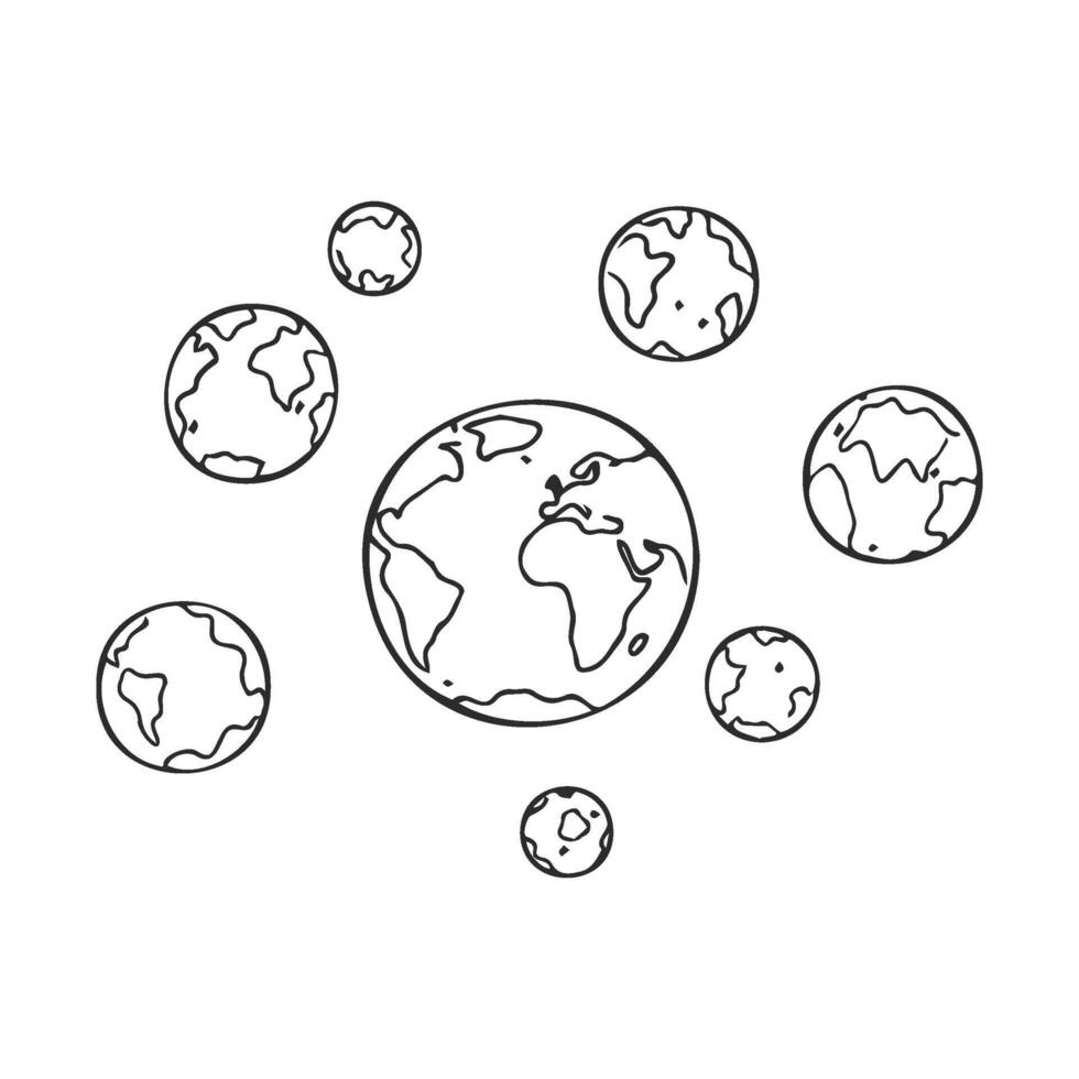 Black and white outline of earth with multiple globe variations in space theme Pro Vector