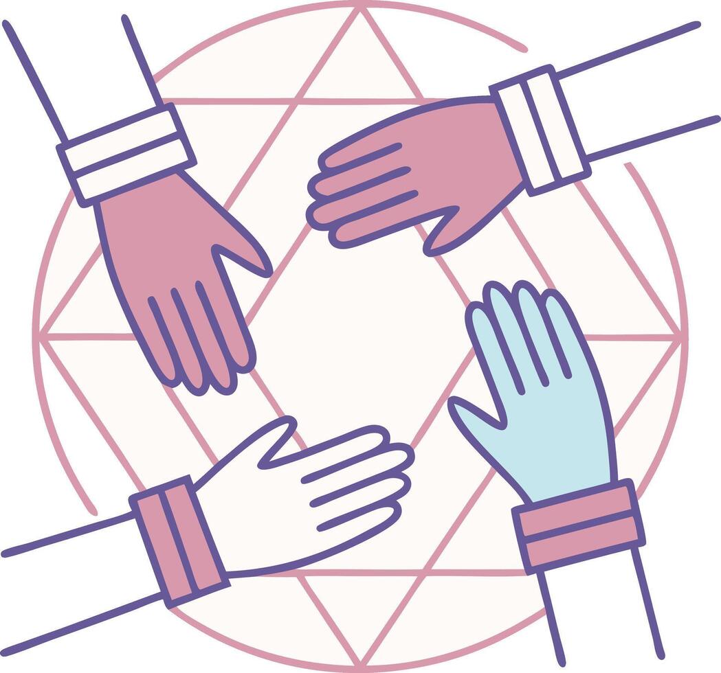 Four hands reaching inward forming circle with geometric pattern Pro Vector