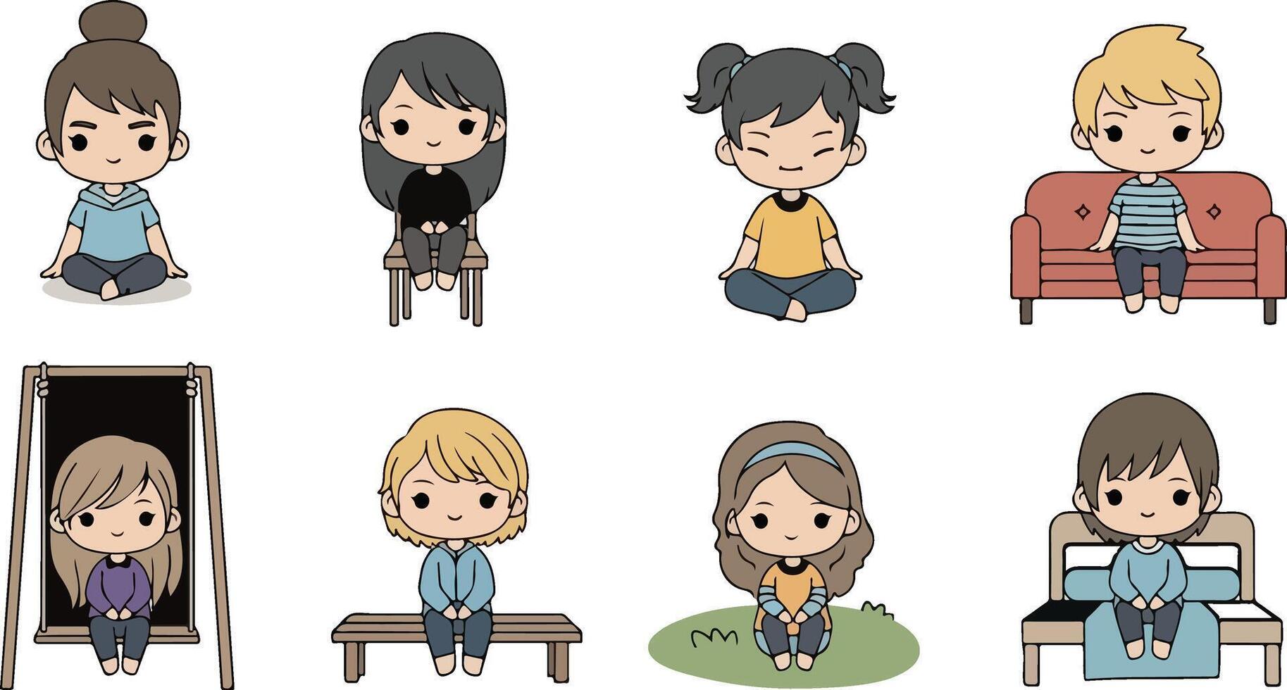 Chibi Characters in Various Settings, An Exploration of Poses and Environments Depicting Calm and Peaceful Postures vector