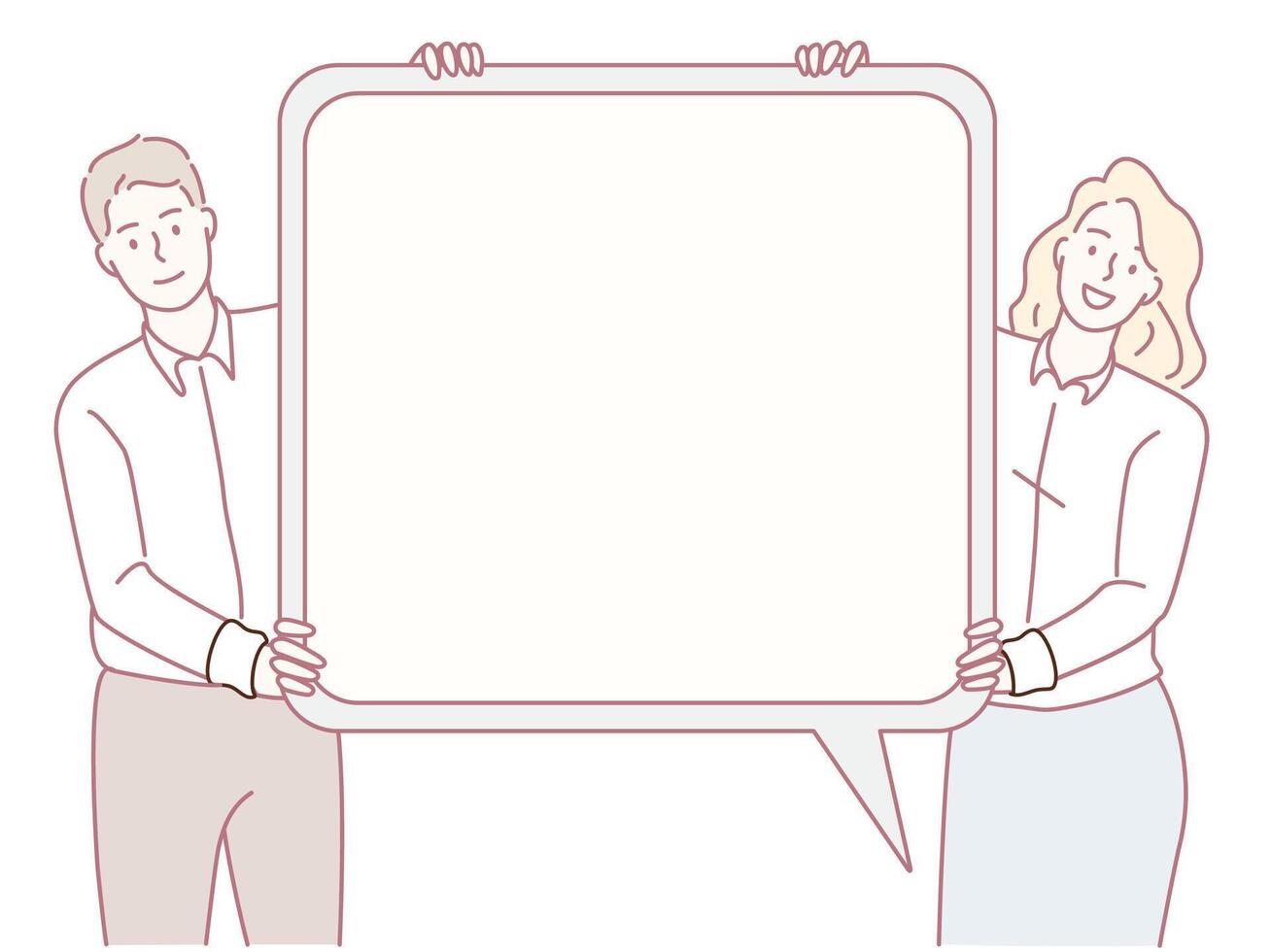 A couple is playfully holding an empty speech bubble, representing open communication and dialogue Pro Vector