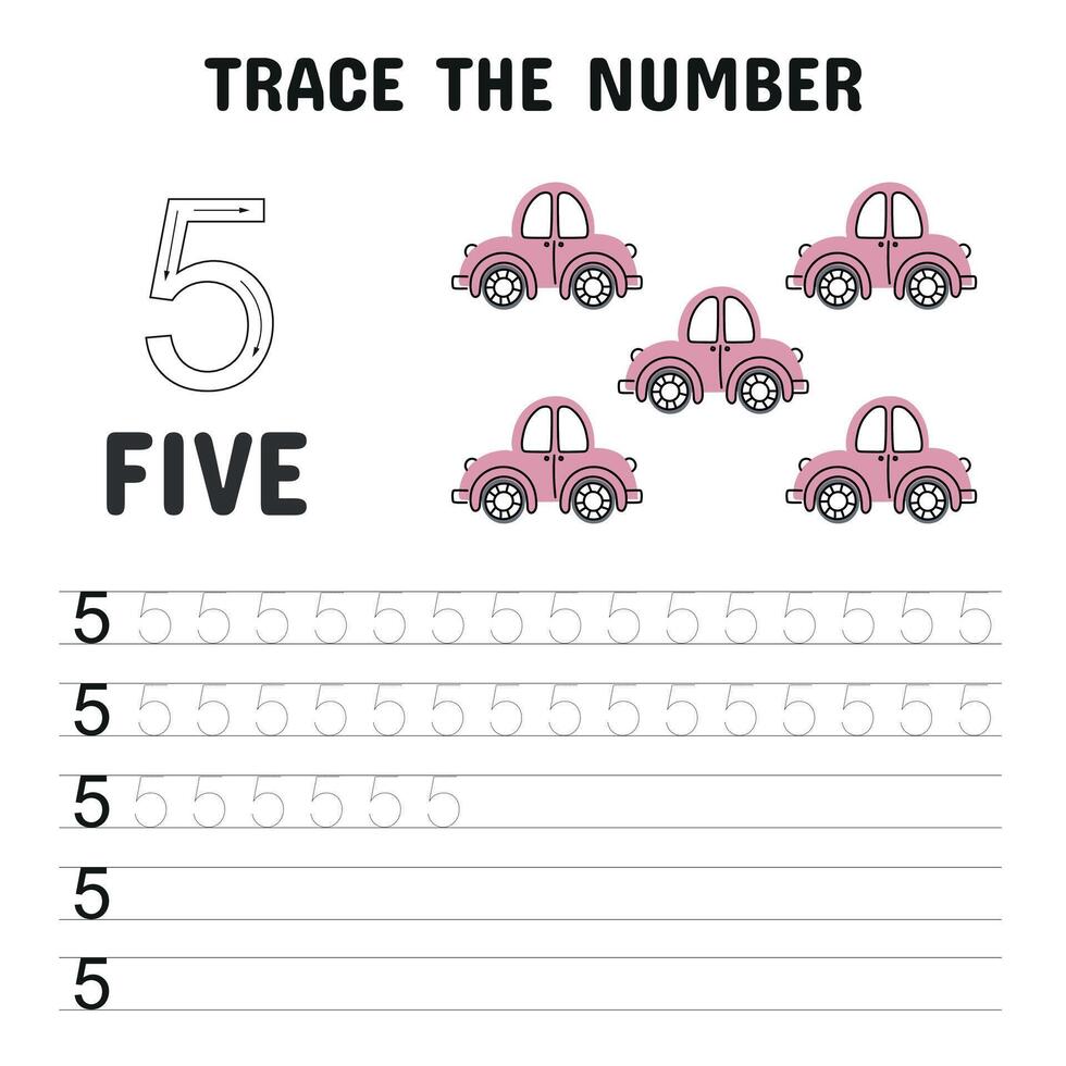 Number tracing worksheet featuring the number 5 and five pink cars. Perfect for helping kids practice writing numbers and counting objects in a fun, visual way. Pro Vector