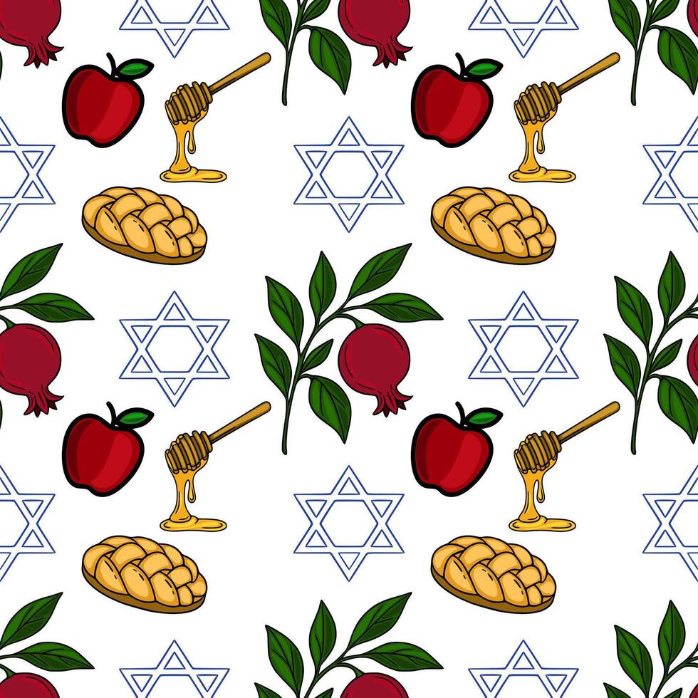 Seamless pattern with handdrawn Rosh Hashanah symbols red apples, honey dipper, pomegranate, challah bread, and Star of David, creating a festive and joyful design perfect for holiday Pro Vector