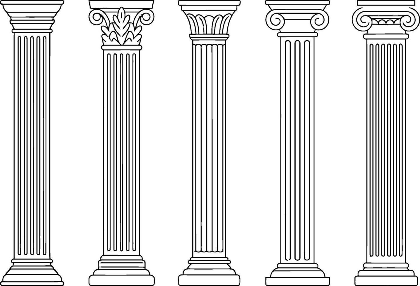Five different styles of classical architectural columns outlined in black pillar architecture Pro Vector