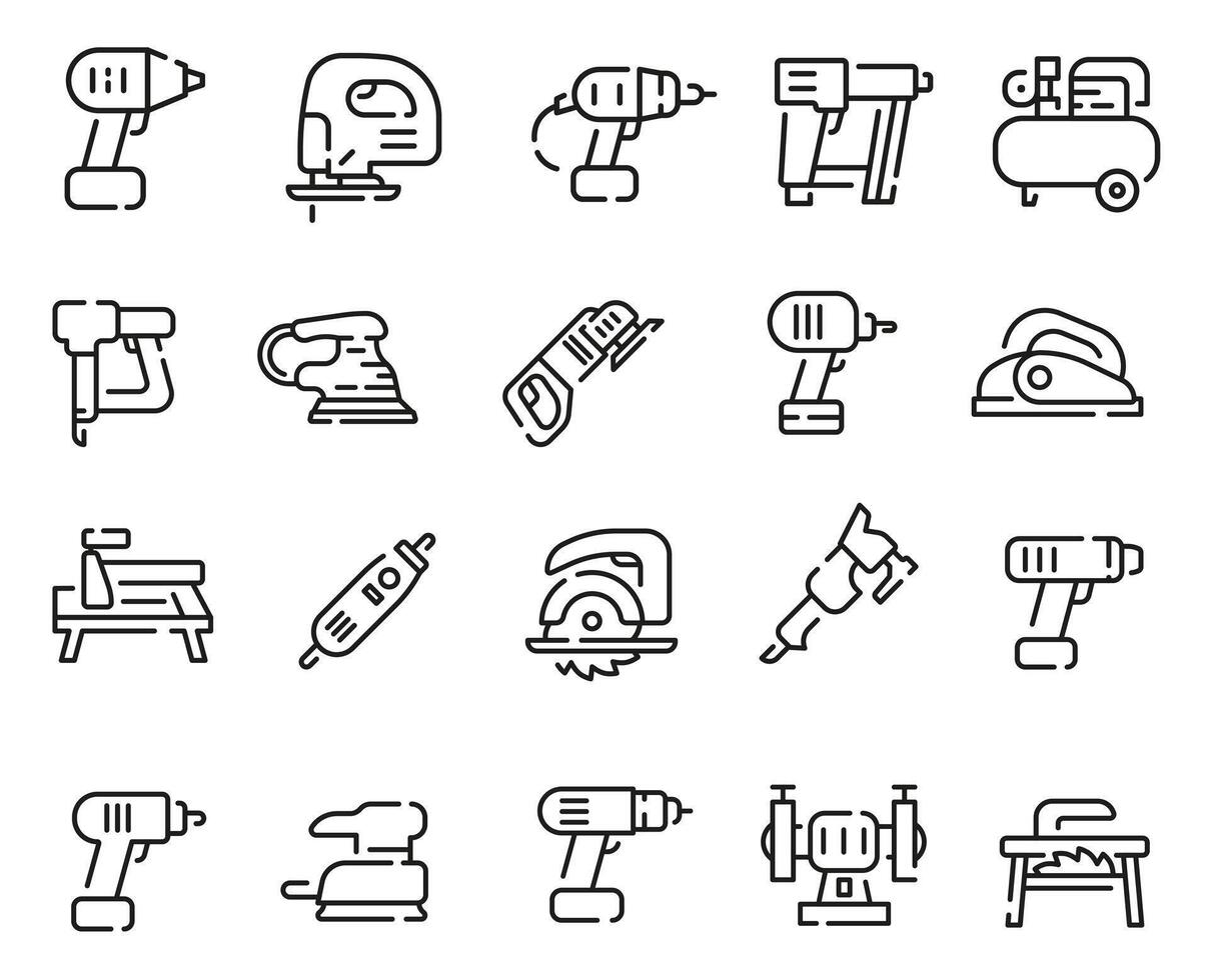 Power tools icon set in outline style with spaces. Power tools icon set in thin line with space. Pro Vector