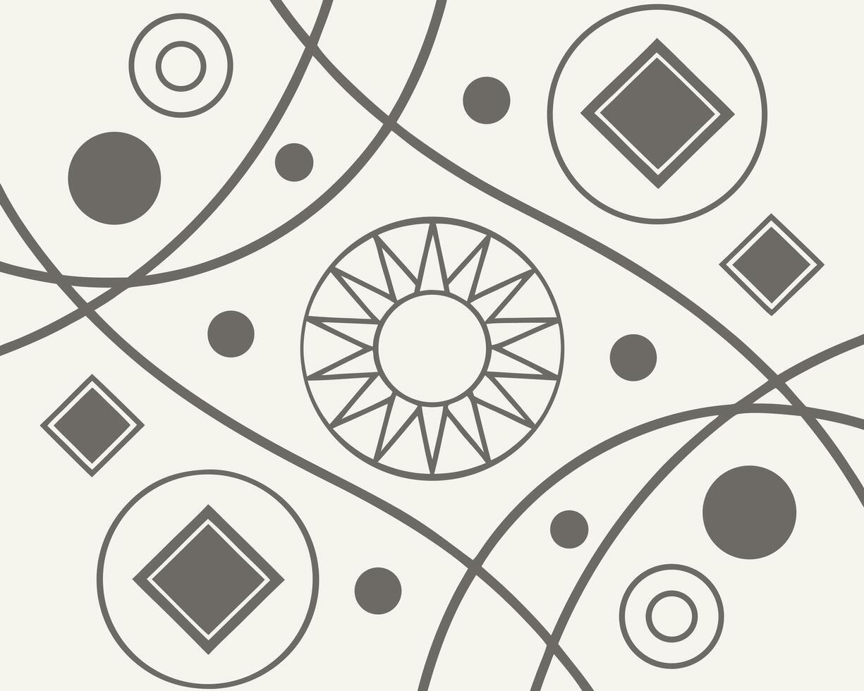Modern abstract design with geometric shapes circles diamonds sunburst pattern and flowing lines on a beige background vector