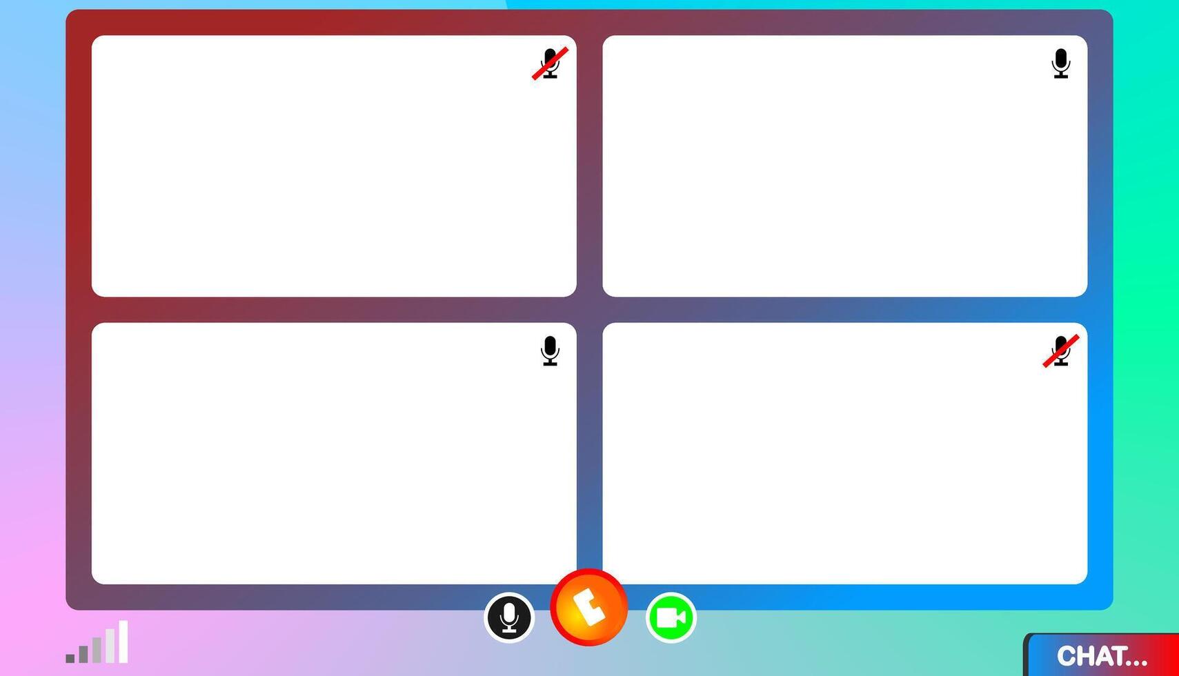 conference template with four blank screen placeholders for participants, microphone and camera controls, and chat function. Ideal for remote meetings and webinars. Pro Vector