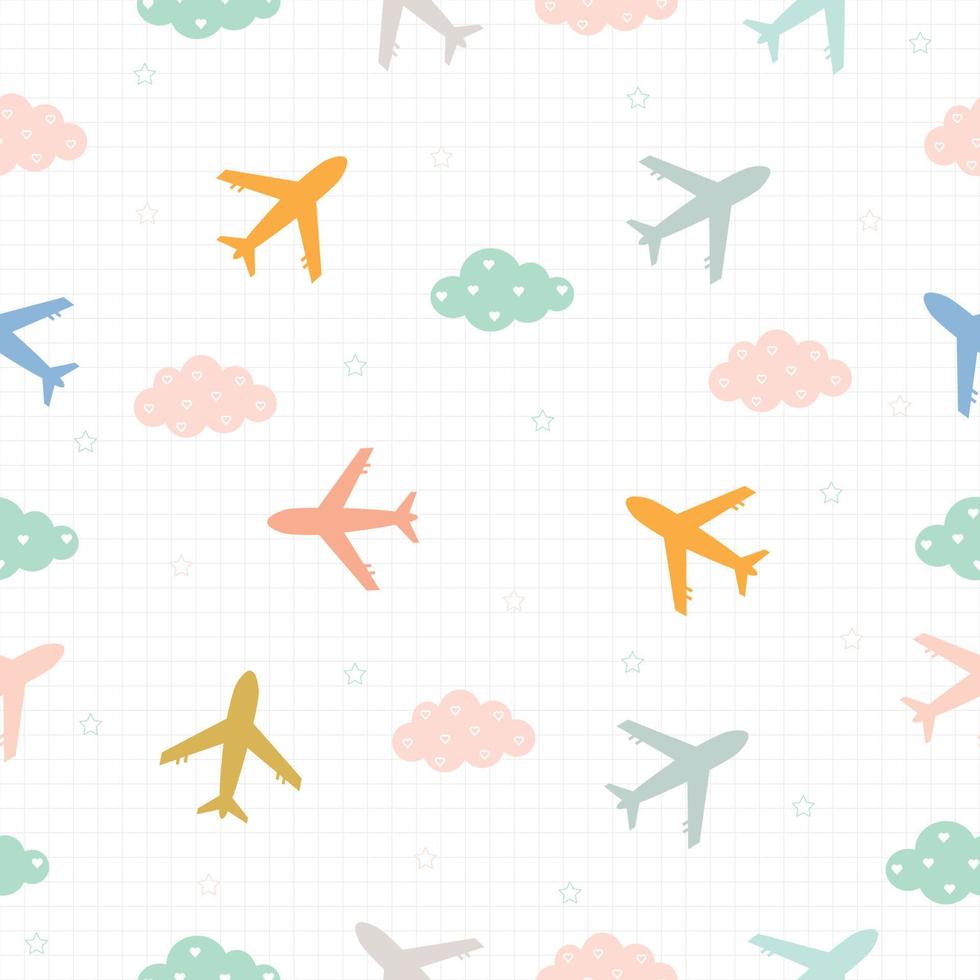 Seamless pattern The background of the plane and the clouds And has the form of a square grid Modern design ideas suitable for textiles, children's clothing, wrapping paper Illustration vector. Pro Vector
