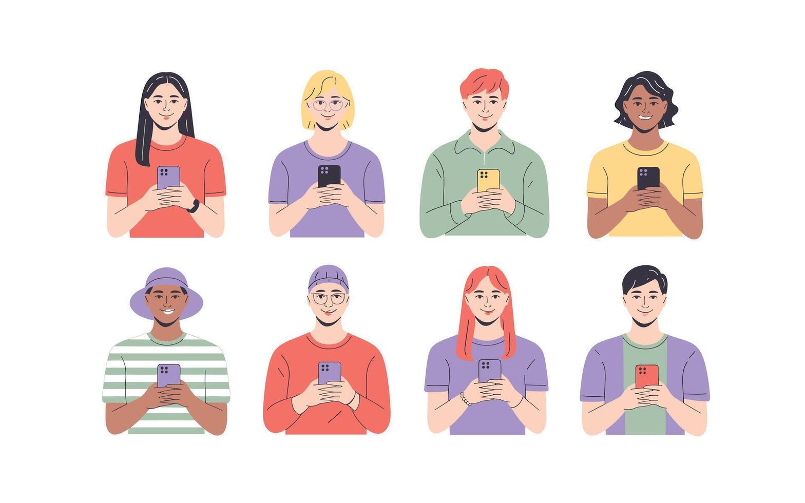 Diverse Group of People Using Smartphones, Communication and Technology Concept, Illustration with White Background, Connectivity and Social Networking Pro Vector