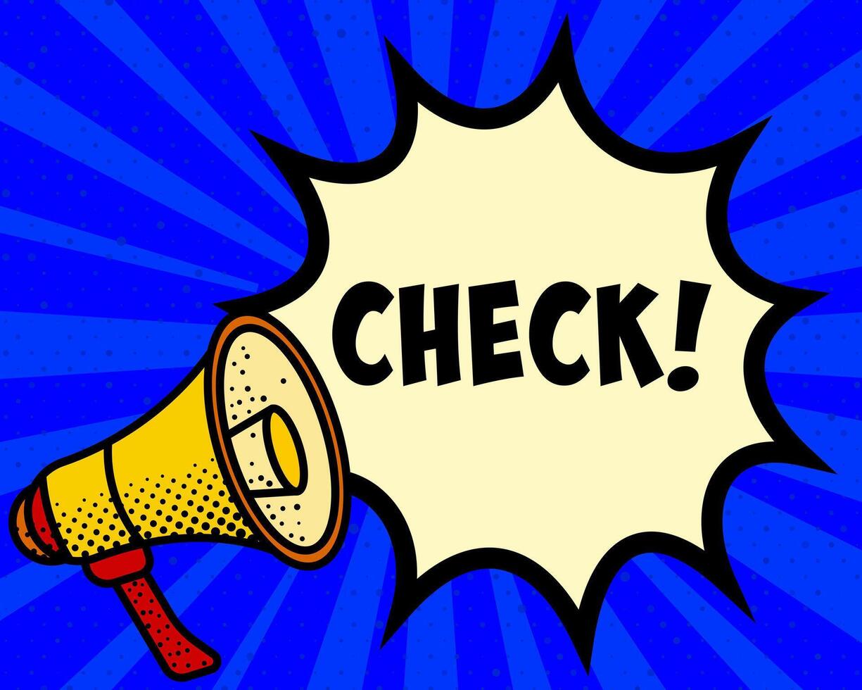 Check announcement speech bubble. Megaphone, speech burst, comic style, bright background, communication element, expression tool, voice projection, information sharing, pop art design. Pro Vector