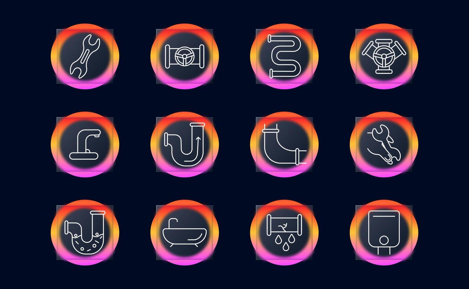 Pipework and plumbing set icon. Outlined visuals of wrench, connector, curve, elbow, clog, leak, tap, valve, tub, heater inside glowing gradient circles on dark background. Pro Vector