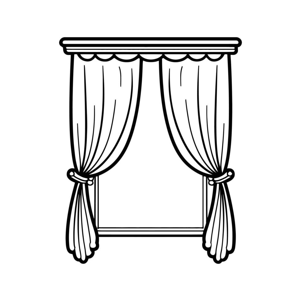 A simple line drawing depicts open window with curtain tiebacks and white background Pro Vector