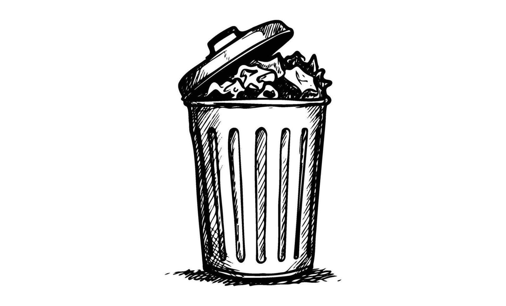 Hand drawngarbage bin with open lid and trash contents in black and white sketch Pro Vector