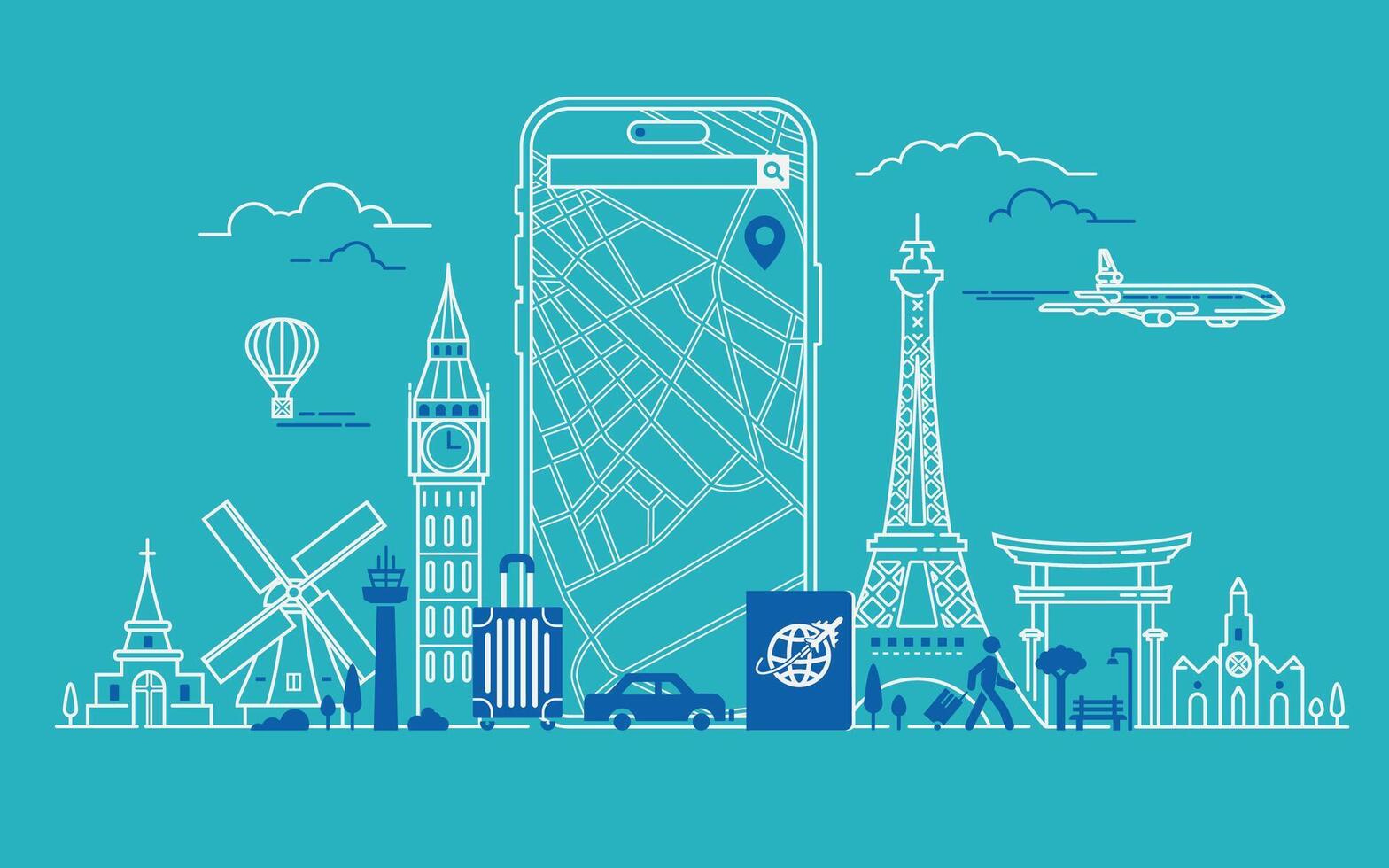concept of smart travel, graphic of smart phone with gps application and travel element such as Eiffel tower and Big Ben Pro Vector