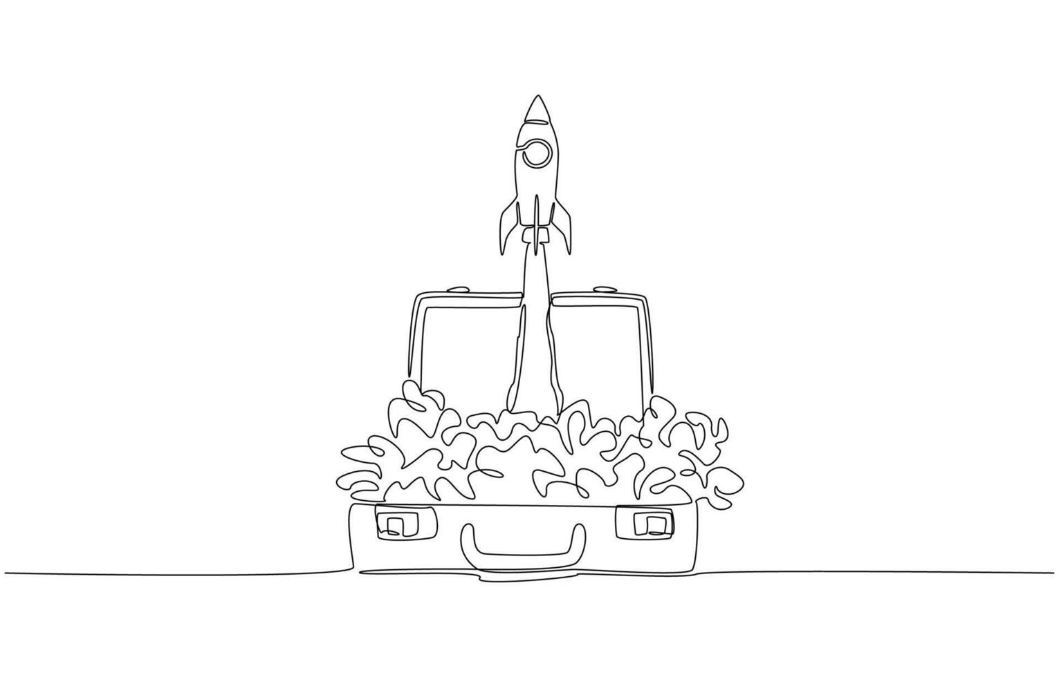 Continuous one line drawing of a rocket launching out of an open briefcase, symbolizing innovation, entrepreneurship, startup energy concept, single line art Pro Vector