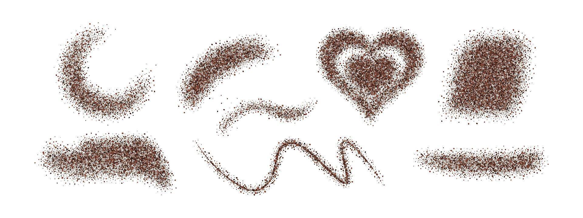 Coffee powder abstract shapes collection. Realistic 3D granule splashes in heart, curve, swirl, and spot forms. dust texture set Pro Vector