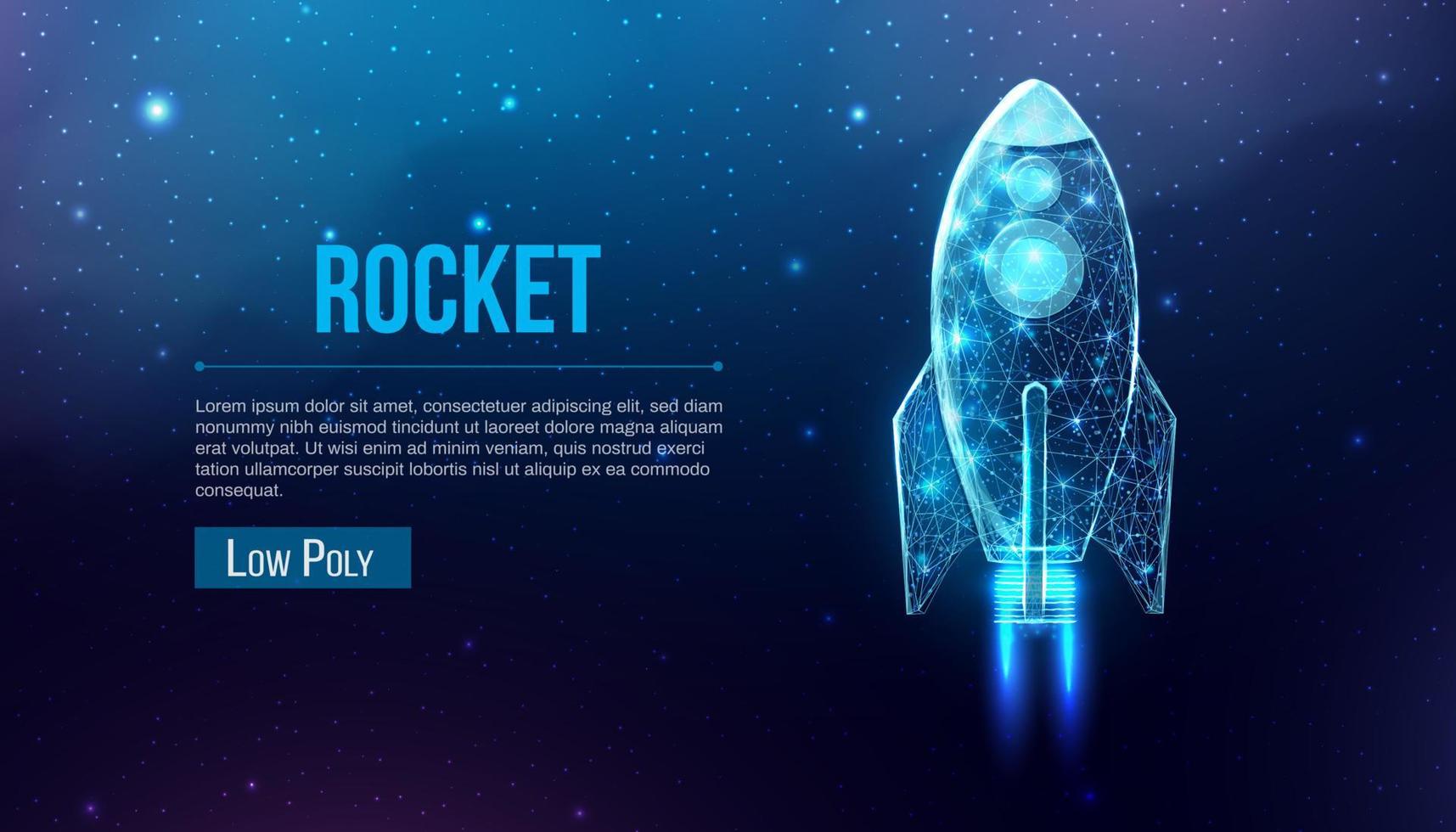 Rocket launch, wireframe polygonal style. Internet technology network, business startup concept with glowing low poly rocket. Futuristic modern abstract background. Vector illustration. Pro Vector