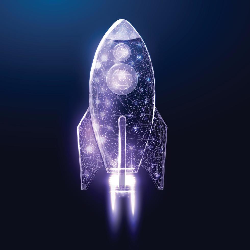Wireframe polygonal rocket. Internet technology network, business startup concept with glowing low poly rocket. Futuristic modern abstract. Isolated on dark blue background. Vector illustration. Pro Vector