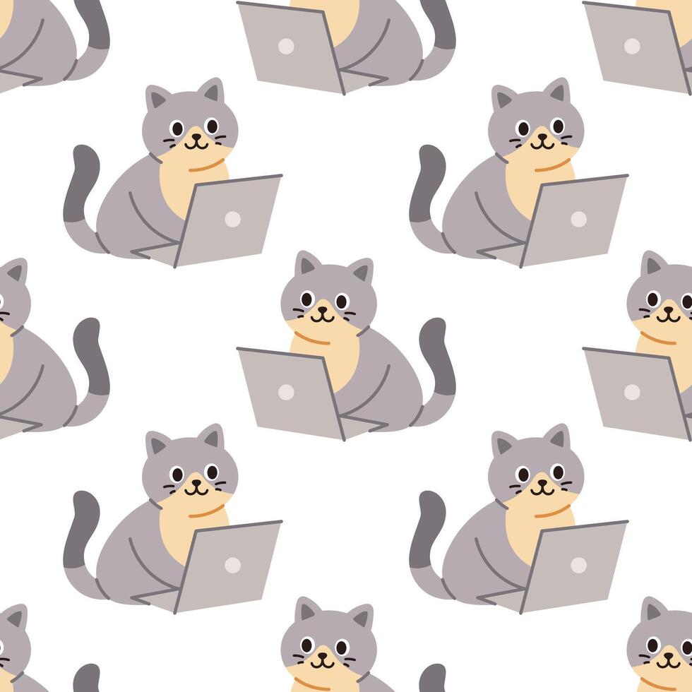 seamless pattern with gray cats with laptops. Cute working kittens on white background. Pattern design for wrapping paper, wallpaper, fabric. Funny print with cheerful cats. Pro Vector