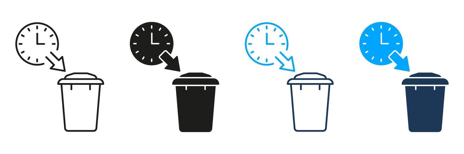 Clock And Trash Bin Line And Solid Icon Set. Time Management, Task Scheduling, And Deadline Reminder Silhouette Symbol Collection. Waste Reduction And Efficiency. Isolated Illustration Pro Vector