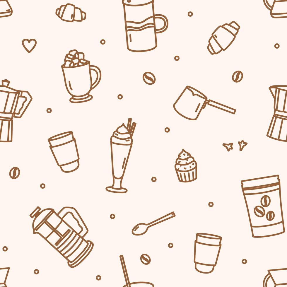 Monochrome seamless pattern with tools and utensils for coffee brewing drawn with contour lines on light background. illustration in linear style for wrapping paper, fabric print, wallpaper. Pro Vector