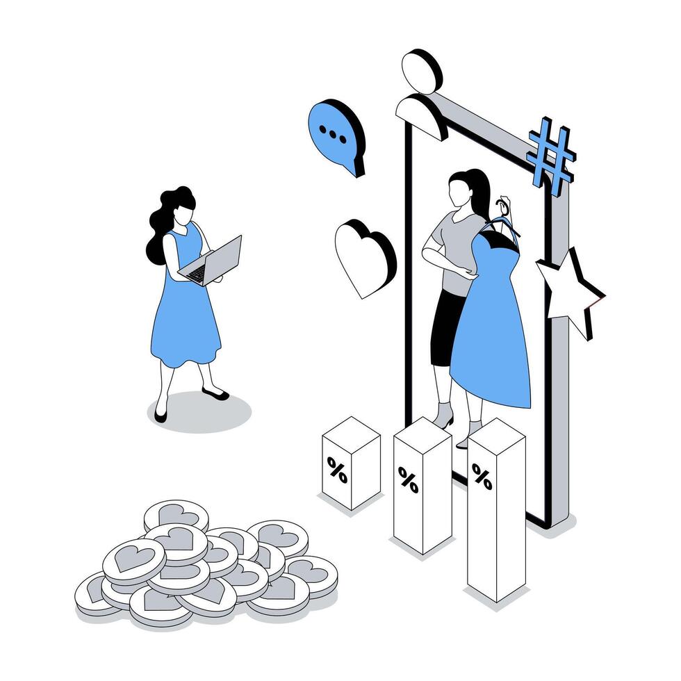 Blogging 3d isometric concept with isometry people design for web. Blogger creating review in fashion blog with information, analyzing data, attracting followers and likes. illustration Pro Vector