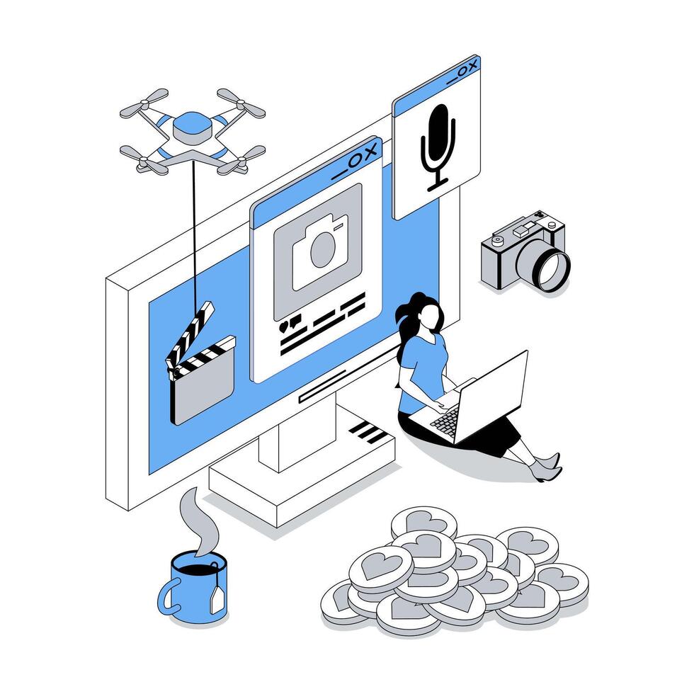 Blogging 3d isometric concept with isometry people design for web. Blogger creating , photo and audio content in personal social media, developing blog and getting followers. illustration Pro Vector