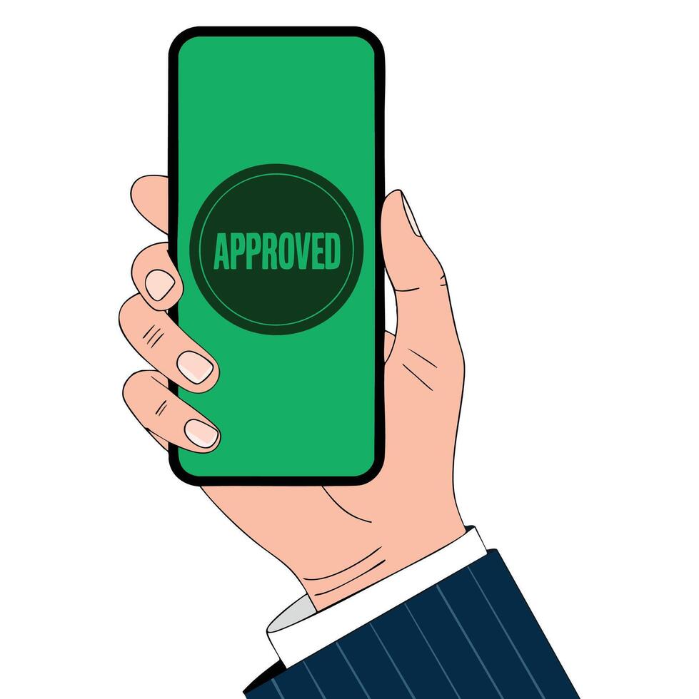 Mobile phone held in hand with green checkmark on screen, symbolizing success notification for app update or payment finish in flat style Pro Vector
