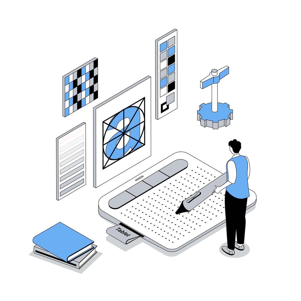 Designer studio 3d isometric concept with isometry people design for web. Illustrator drawing digital content with stylus on graphic tablet, selecting colours swatch to project. illustration Pro Vector