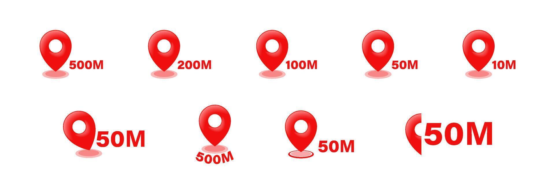 Location distance icon set. Map pin collection. Locator radius pointers. Pro Vector