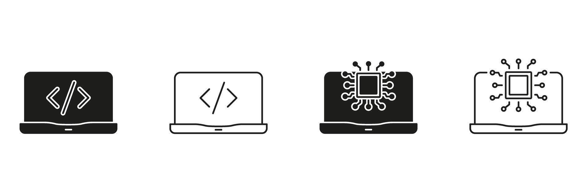Laptop With Code And Microchip Line And Solid Icon Set. Software Development And Ai Technology Symbol Collection. Programming And Machine Learning Concepts. Isolated Illustration Pro Vector