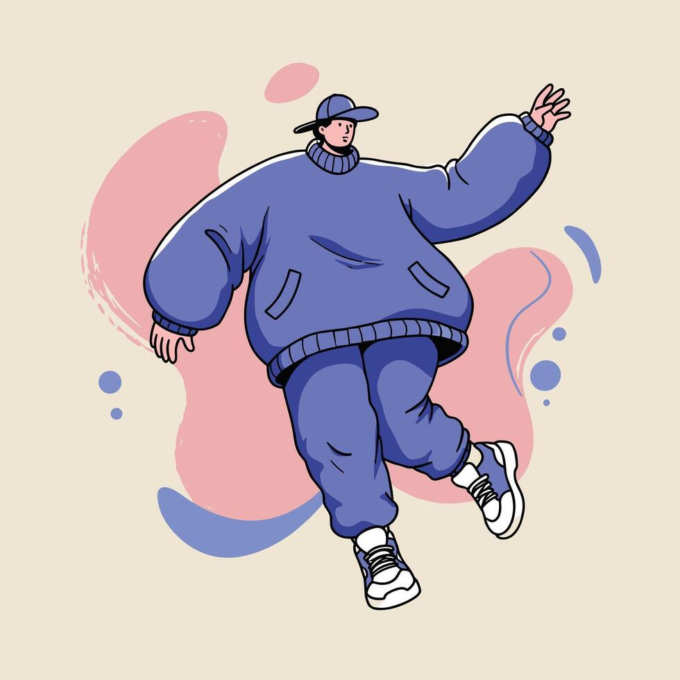 Stylized character in casual streetwear with dynamic pose and abstract elements Pro Vector