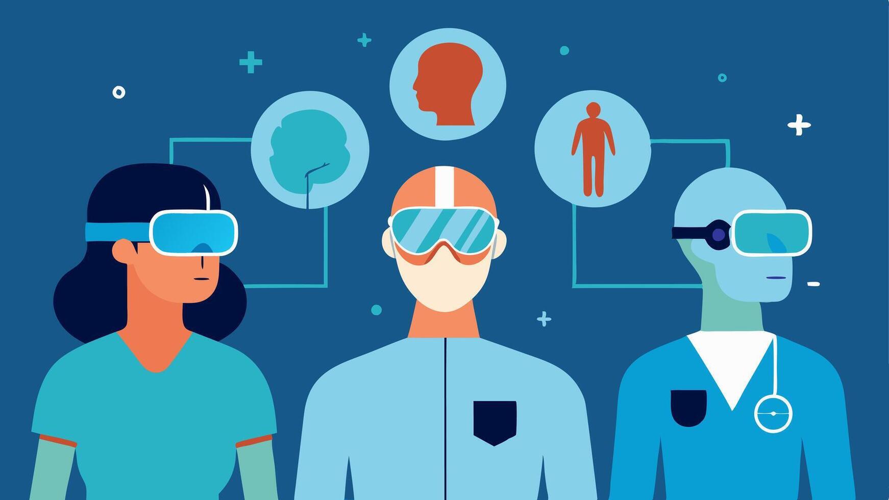 Augmented Reality Training Medical professionals using augmented reality glasses in a simulated setting overlaying anatomical visuals on training dummies for enhanced learning.. Pro Vector