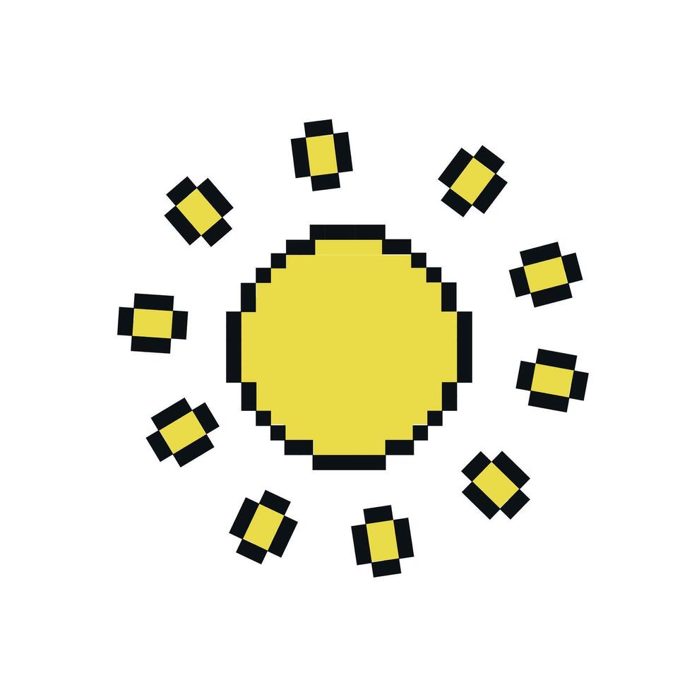 Pixel art yellow sun with rays on white background in retro digital style reminiscent of 8 bit graphics Pro Vector