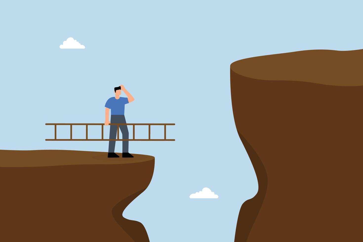 Solution to solve problem, businessman holds ladder that is to be climbed up to higher cliff Pro Vector
