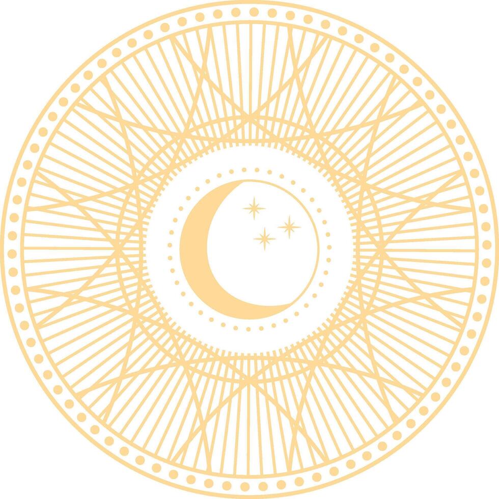 Golden crescent moon with three stars centered within an elaborate circular frame, forming a celestial emblem radiating mystical charm and elegance, suitable for diverse design applications Pro Vector