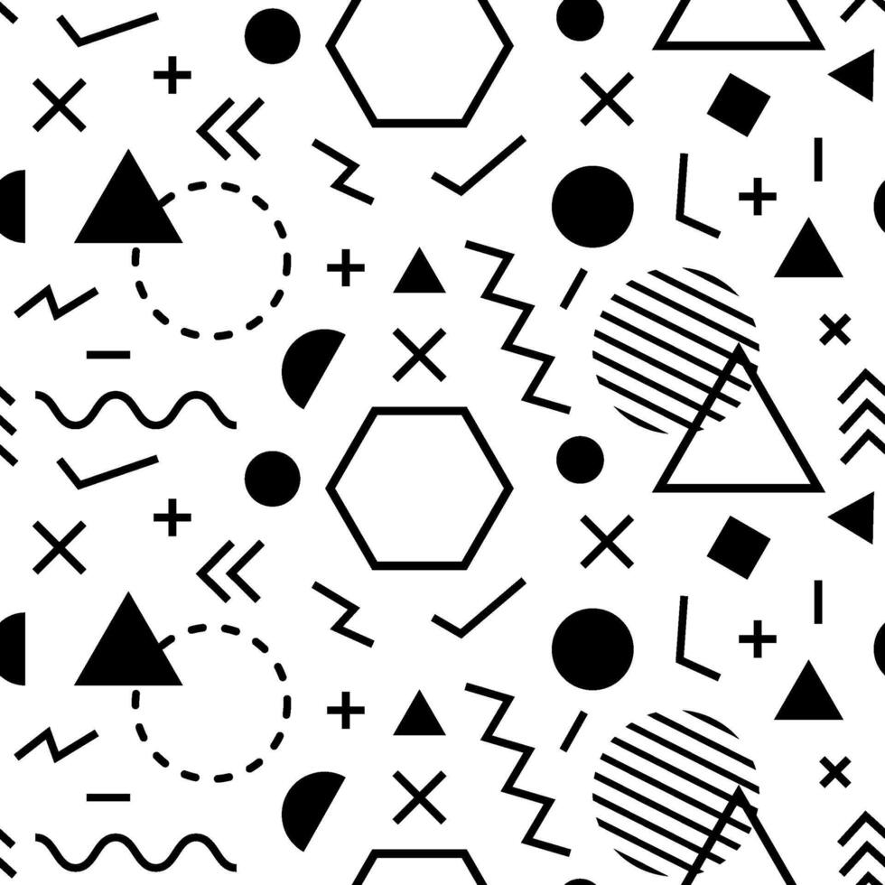 Seamless pattern showcasing dynamic composition of geometric shapes, including triangles, circles, hexagons, and lines, forming visually engaging design Pro Vector