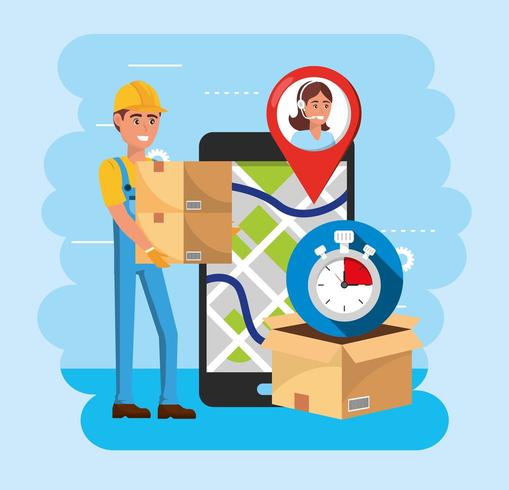 delivery man with boxes and smartphone with map location and call center service Free Vector