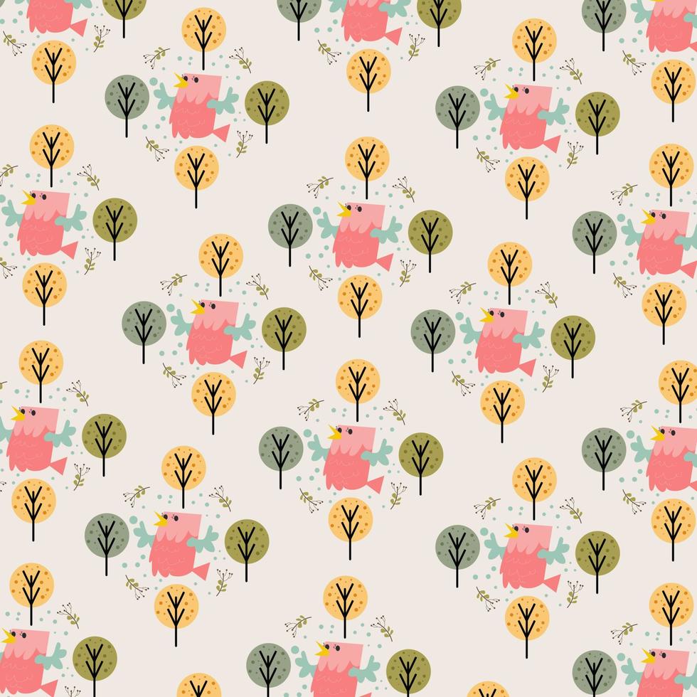 Cute big bird pattern background with small trees around. Perfect for wallpapers, web page backgrounds, surface textures, textiles. Pro Vector