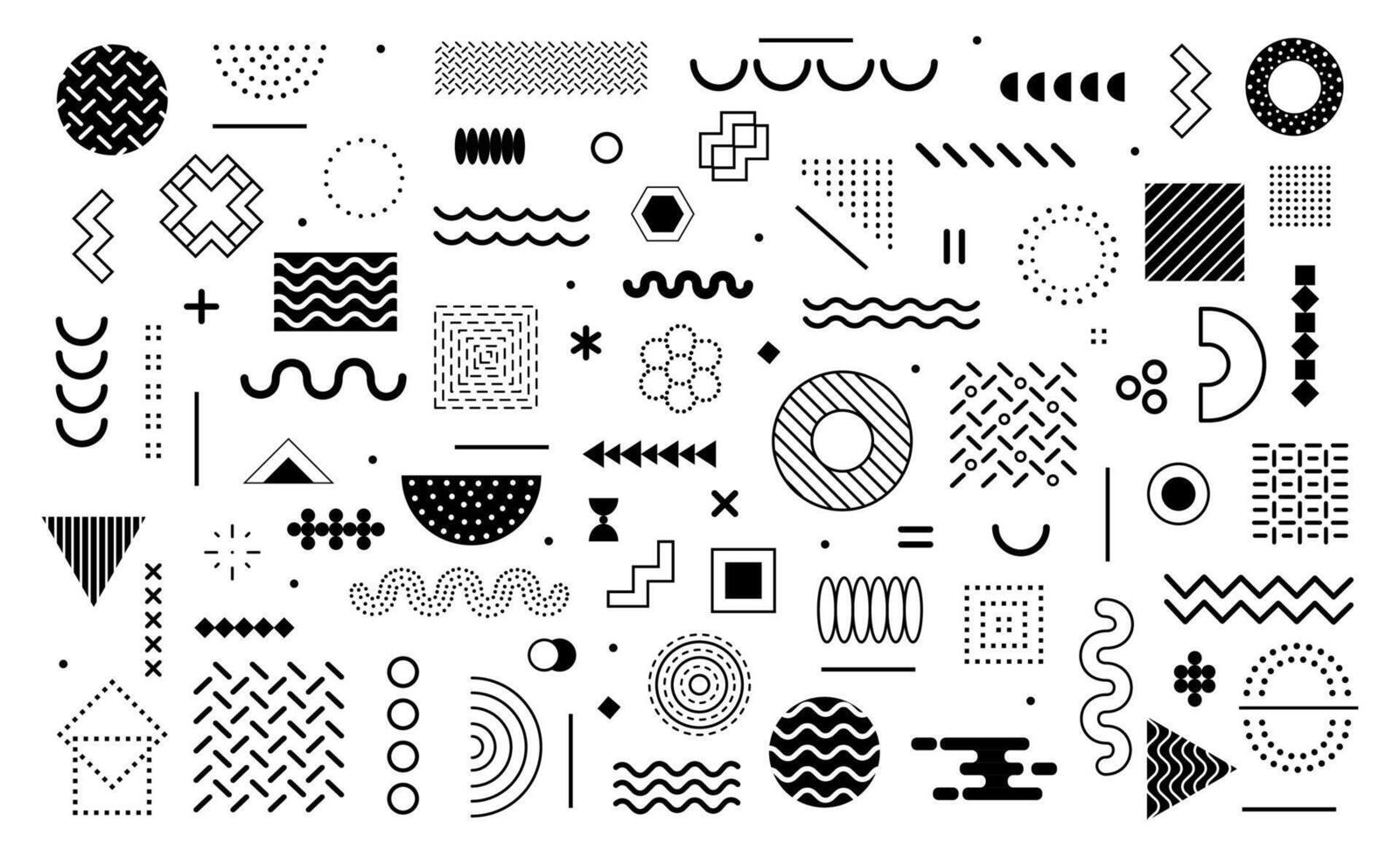 Abstract geometric element. Memphis style elements. Retro 80s aesthetics composition with halftone, dots, triangles, patterns, lines, circles, geometric figures, forms. set Pro Vector