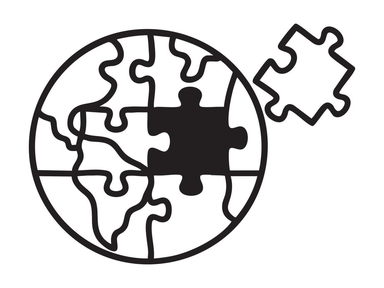 Black outline of world map puzzle pieces isolated on white background. concept of earth, global puzzle, geography, education, problem solving, learning tool, design element. Pro Vector