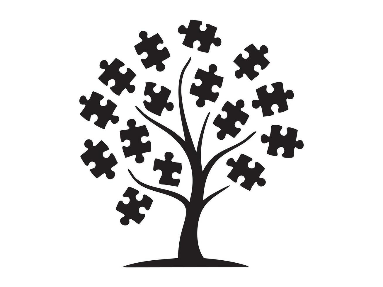 Black silhouette of a tree with puzzle pieces as leaves, isolated on white background. concept of unity, growth, mystery, knowledge, creative problem-solving, educational art, mind game Pro Vector