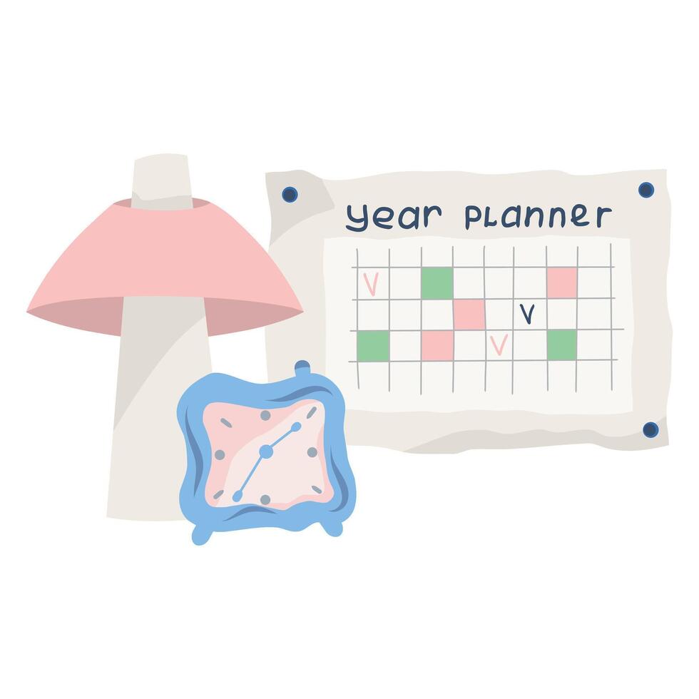 Desk Calendar with Lamp and Clock, Yearly Planner Illustration with Alarm Clock, Schedule and Light, Minimal Desk Setup Pro Vector