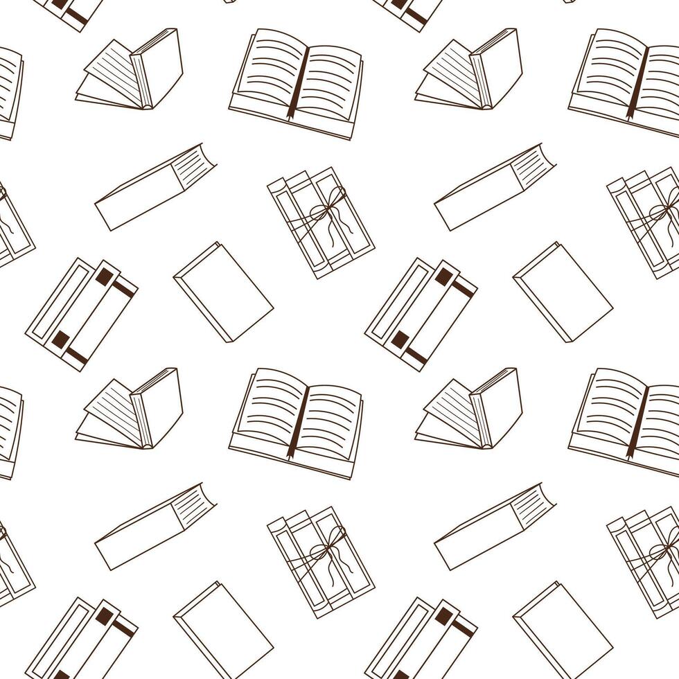 Seamless pattern with different books, line art. Stacks of books for reading, open books. Flat pattern, outline, doodle. Pro Vector