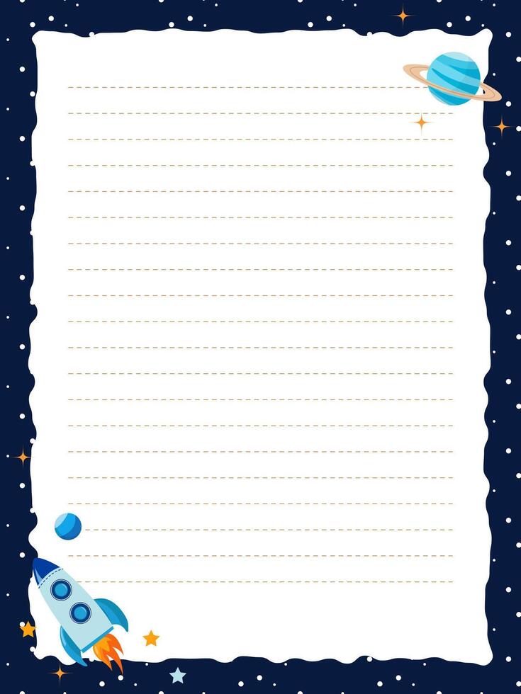 Notebook or diary page template with starry sky, rocket and stars. Simple flat illustration Pro Vector