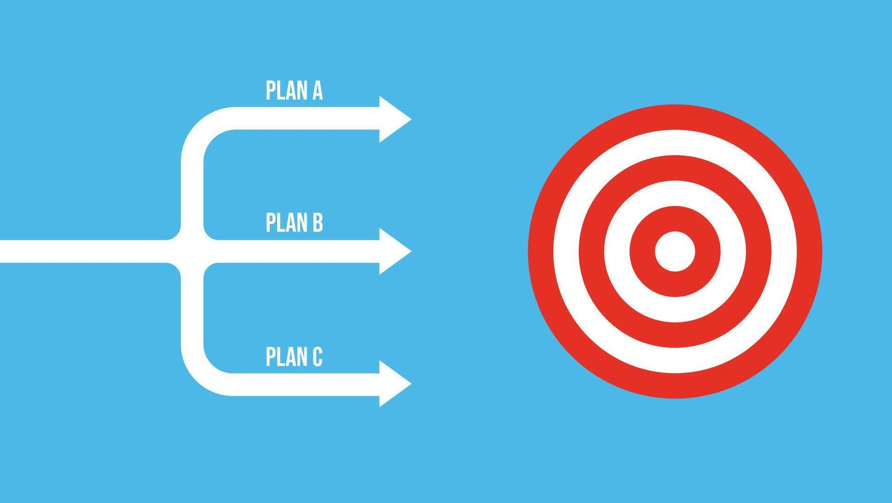 Target with three labeled horizontal arrows for Plan A, Plan B, and Plan C on blue background representing multiple strategies, business planning, decision making, goal achievement, problem solving Pro Vector