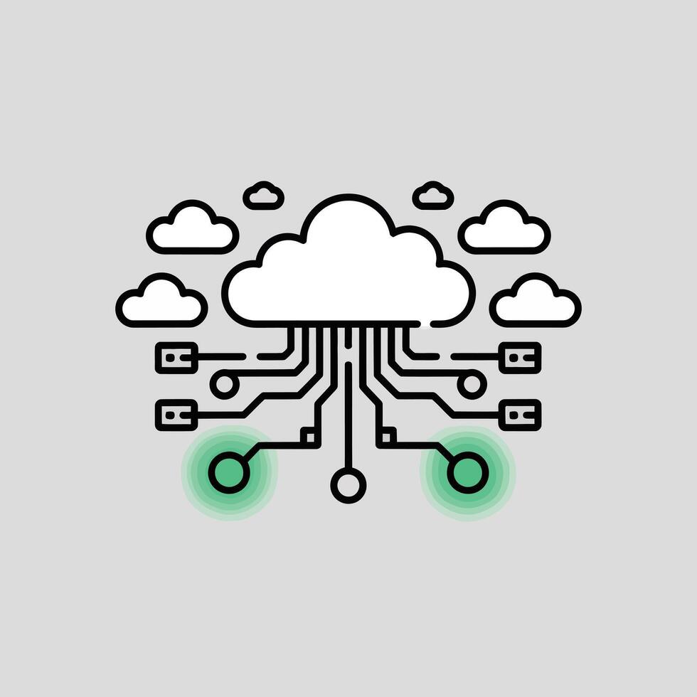 Network Cloud Computing Minimalist Illustration Featuring a Large Central Cloud Connected to Smaller Clouds via Circuit Board Style Lines and Circular Connectors Light Green Accents Pro Vector
