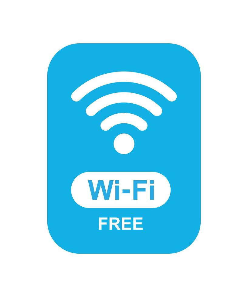 Blue free Wi-Fi label with wireless signal icon and text, representing internet connectivity, hotspot service, and public network access on a white background. Pro Vector