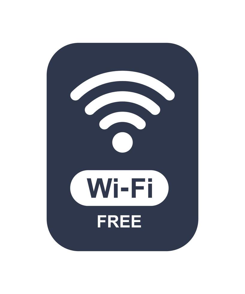 Dark blue free Wi-Fi label with wireless signal icon and text, symbolizing internet connectivity, hotspot service, and public network access Pro Vector