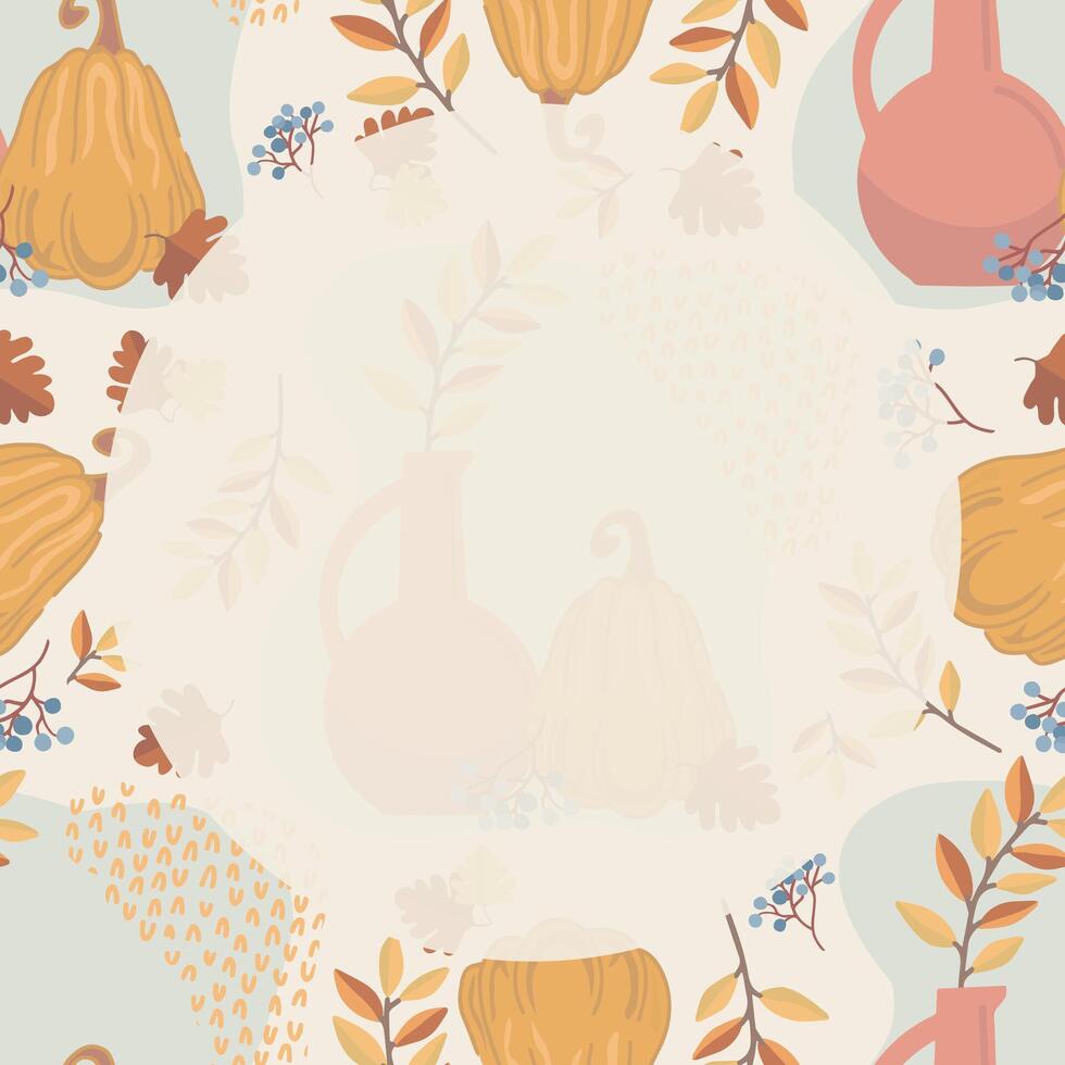 Fall card with warm autumn elements and empty space for text, surrounded by pumpkin and pink ceramic vase. Great for invitations, social media content, and print projects Pro Vector